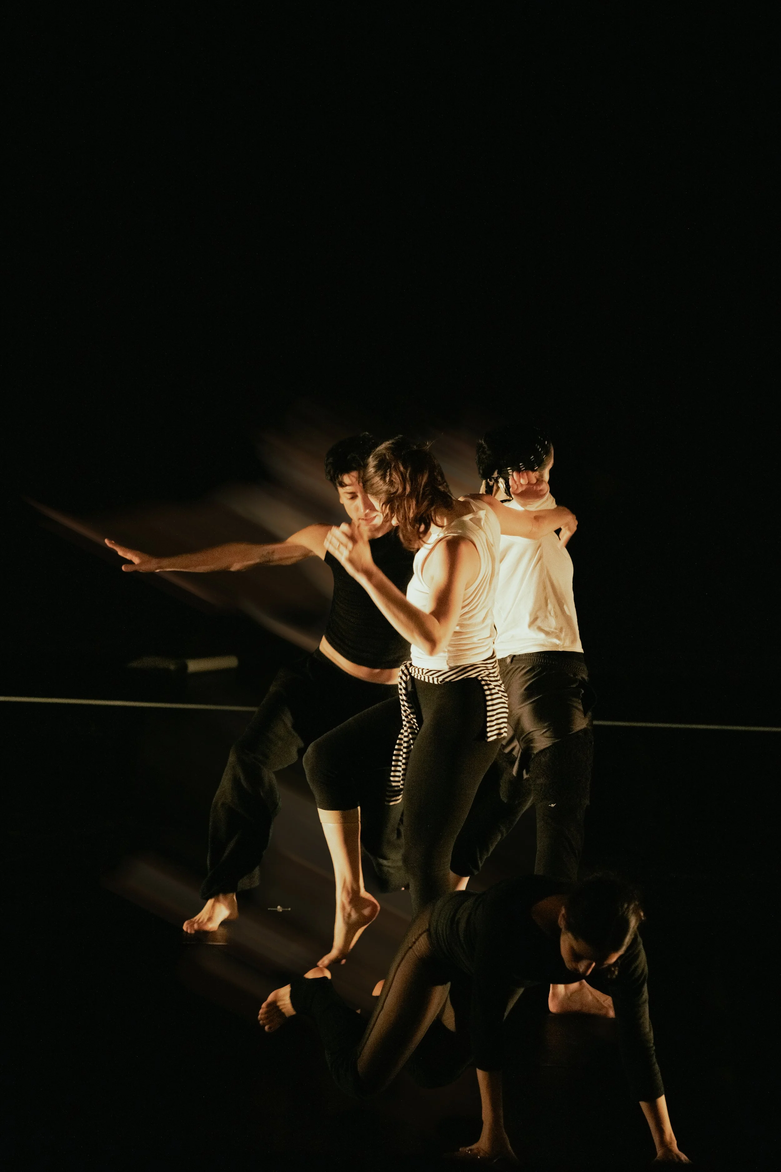is an evening length dance theater work that places the audience inside a rehearsal, where four performers follow a mysteriously prescribed script. They repeat, forget, and question their lines and actions as they test when to lead or follow, and when to continue or pause.